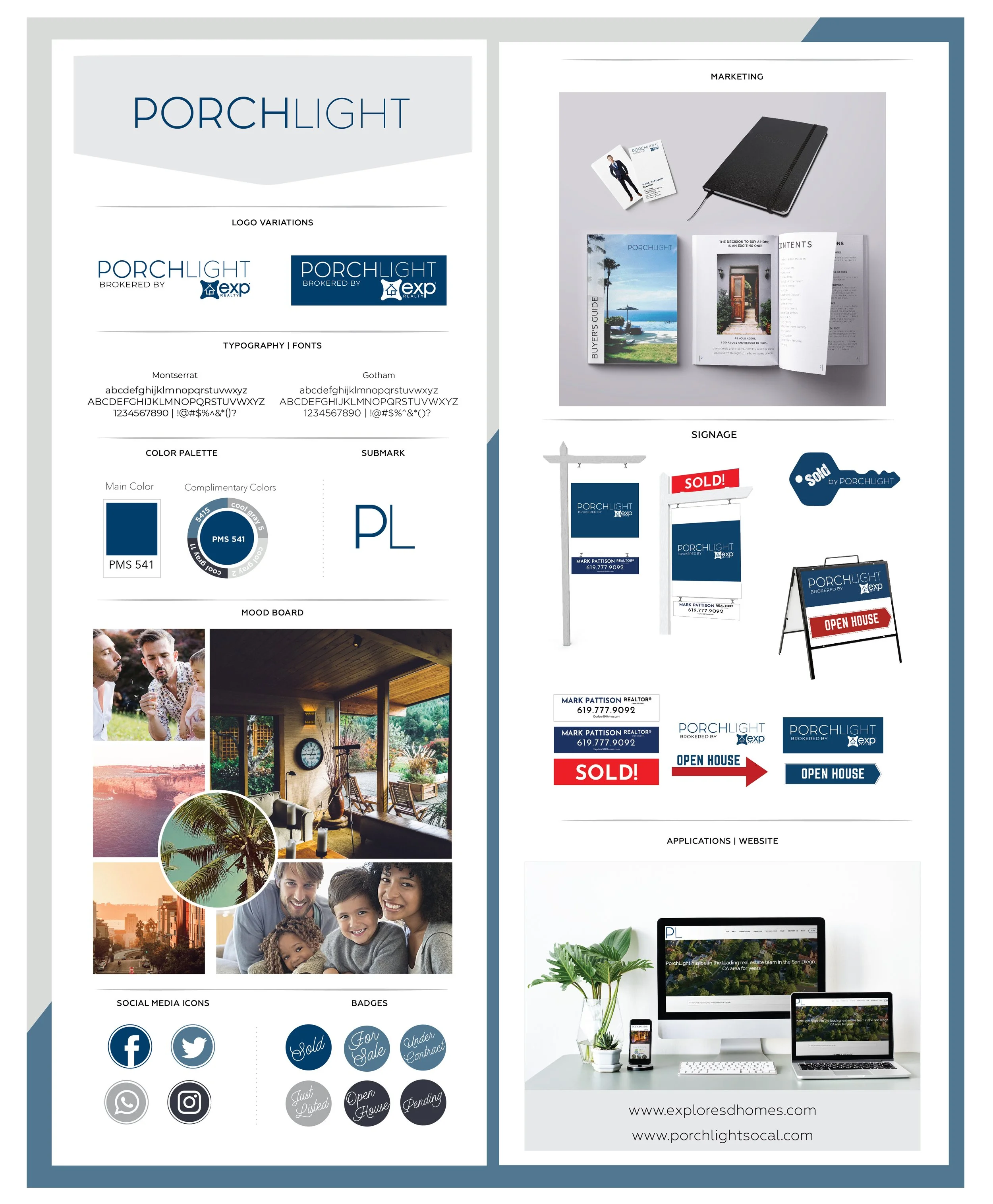 I worked with Mark Pattison, owner and team leader of PorchLight to create his SoCal logo, full brand kit and all marketing materials including, client guides, signage, and online social media assets.